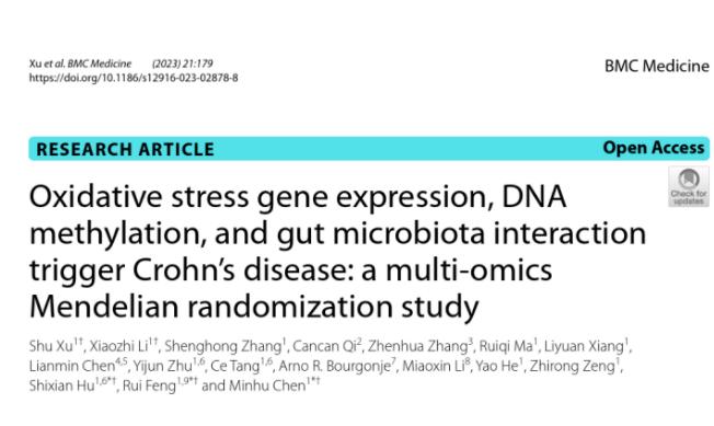 近日,中山大学附属第一医院消化内科陈旻湖教授、冯瑞教授团队的研究论文“Oxidative stress gene expression, DNA methylation, and gut microbiota interaction trigger Crohn’s disease: a multi-omics Mendelian randomization study”,以论著形式在国际知名学术期刊BMC Medicine(IF:11.15)杂志正式发表。小妲己直播app 陈旻湖教授、冯瑞副主任医师和胡世贤副研究员为该论文共同通讯作者,研究生徐舒和李晓智为共同第一作者,小妲己直播app 及小妲己直播app (自治区人民医院东院)(简称小妲己直播app )为通讯作者单位。