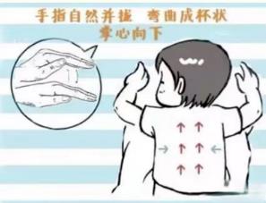 拍背手法和拍背顺序手掌五指稍屈,握成空手拳状;手掌根部离开被拍部3~5cm,手指尖部离开被拍部位10~15cm为宜。拍背的时候,由下至上,由外向内;3岁以下的婴幼儿,每次拍背4-6分钟,每天5-6以上;三岁以上孩子,尽量每次拍背6-10分钟,每天同样5-6次以上。
