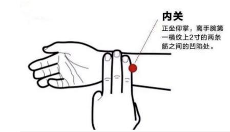 内关穴位置在腕横纹上2寸,掌长肌腱和桡侧腕屈肌腱之间,主要对心胸部症状有调整作用,可改善心脏供血,治疗心脏疾病,如心慌、胸痛、胸闷等。经常揉按内关对心脑血管疾病、失眠、神经衰弱等有效。