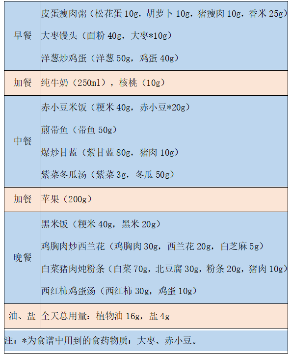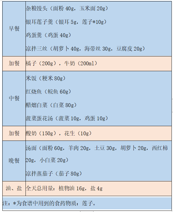 以下食谱适合8岁学龄儿童,提供的能量在1470~1610范围内,蛋白质57~73g,脂肪占总能量比为23%~30%。其他年龄段儿童青少年需根据不同年龄段各类食物建议摄入量进行适当调整。更多食谱示例见《指南》。