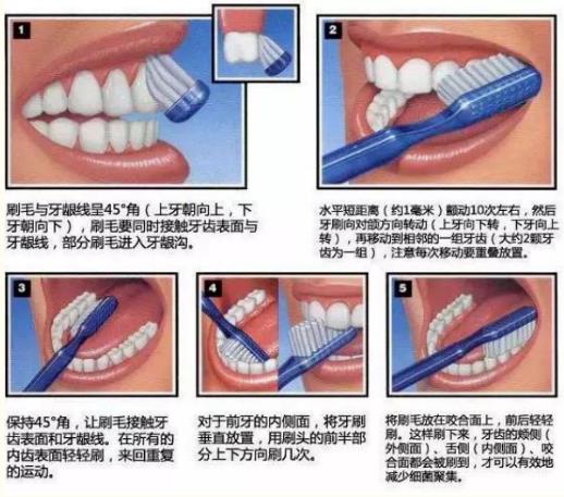 推荐使用巴氏(bass)刷牙法。将牙刷刷毛指向牙根方向,与压面呈45°,采用小幅度的水平向的颤动和垂直向的“拂刷”两个动作刷牙。另外,要选择含氟牙膏,早晚刷牙,每次至少2分钟。
