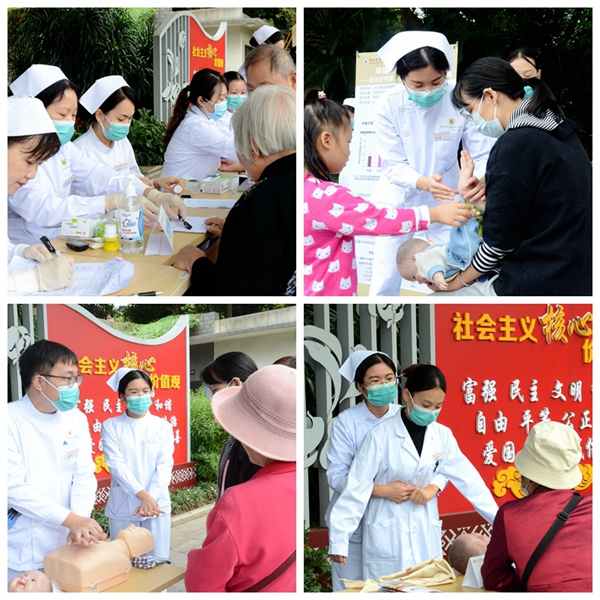 医护人员为现场群众测量血压和血糖,细致解答群众提出的各类健康问题,讲解老年群体易患疾病的症状及处理方式,合理用药及后期复查注意事项。为了帮助群众进一步提高应急自救互救能力,急诊科医护人员还现场演示了心肺复苏、溺水急救、海姆立克法等急救措施。