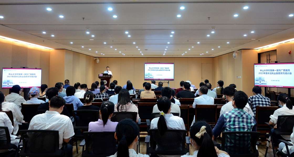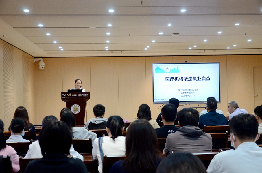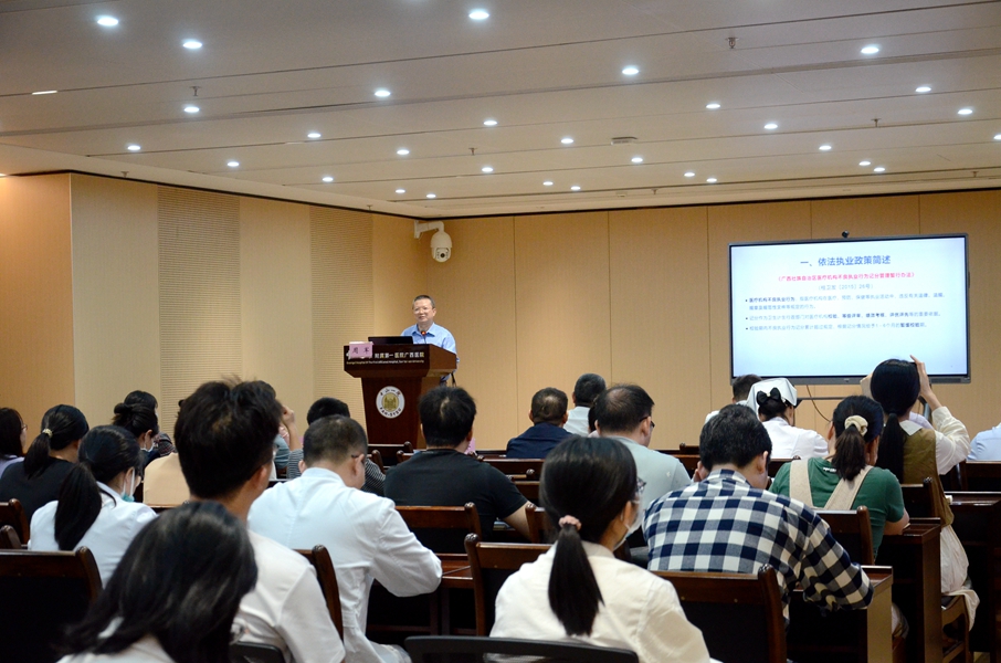 为深入贯彻落实医疗机构依法执业自我管理主体责任,增强医务人员法治意识,规范从业行为,提高医疗服务质量和安全,10月19日、23日,小妲己直播app (自治区人民医院医院)(简称小妲己直播app )举办2023年度依法执业自查系列培训会。小妲己直播app 党委书记张国、副院长夏文豪及相关临床、医技、职能科室医护人员参加。培训会邀请了自治区卫生监督所监督四科科长/四级调研员周军,南宁市卫生计生监督所医疗机构监督科科长冯云新、陈丹,自治区人民医院医疗管理科李思华进行授课。培训会由夏文豪主持。