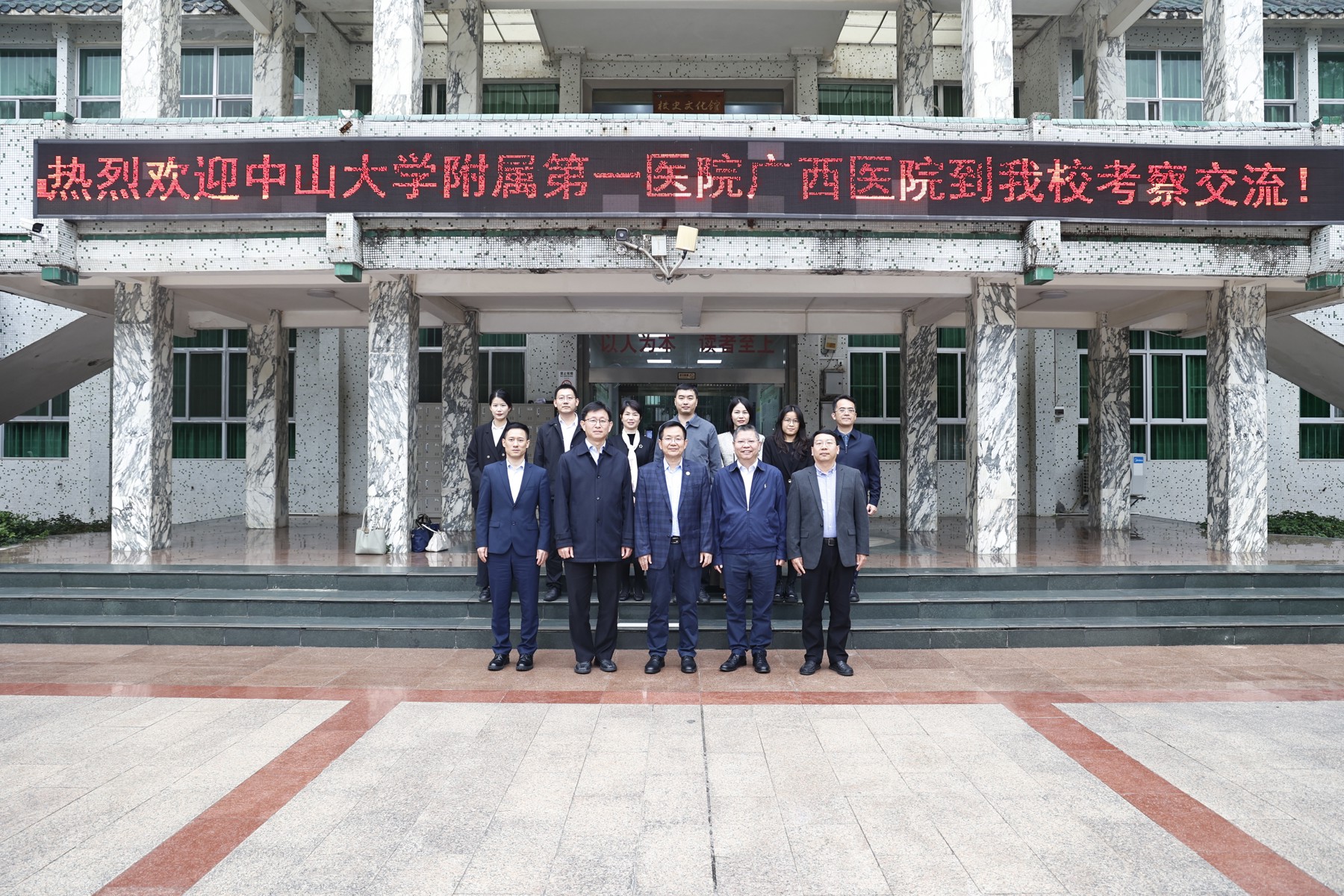 )执行院长李健、党委书记张国、副院长夏文豪等一行到百色市右江民族医学院参观交流,并围绕学科发展、人才培养等内容召开座谈会。右江民族医学院校长李雪斌、副校长王俊利、教务处处长韦忠恒、研究生院院长曾怡及两院相关科室负责人参会。座谈会由王俊利主持。