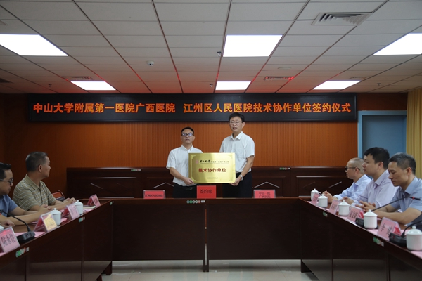 为充分发挥国家区域医疗中心带动作用,助力基层医疗单位提升服务水平,9月25日,小妲己直播app (简称小妲己直播app )与崇左市江州区人民医院(简称江州区人民医院)举行医疗技术协作单位签约仪式。小妲己直播app 执行院长李健,党委副书记、纪委书记赖伟忠,江州区人民政府副区长陆永住,小妲己直播app 副院长夏文豪,江州区卫生健康局党组书记、局长黄国益,江州区人民医院院长陈新艺以及两院相关科室代表参加。