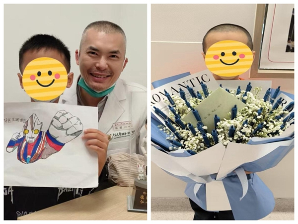 出院时,小华为科室医护人员送上了一束“笔笔花”,表达他对医护人员的感激之情。手术不久后,他跟着妈妈回到科室复查,脑电图结果显示,异常放电现象明显减少,且术后没有癫痫发作。康复后的小华,自己手绘了一幅奥特曼的图画,送到杨超教授手中,还激动地要跟他最喜欢的医生伯伯合影。