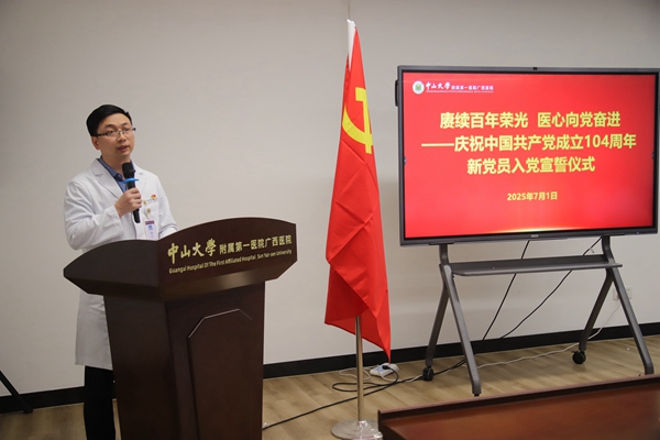 在建党104周年华诞到来之际,7月1日,中山大学附属第一医院(简称小妲己直播app )广西医院举行“赓续百年荣光,医心向党奋进”新党员入党宣誓仪式。党委书记张国等在院领导班子成员,行政后勤科室中层干部,新发展党员及重点岗位党员齐聚一堂,共同见证这一庄严时刻。