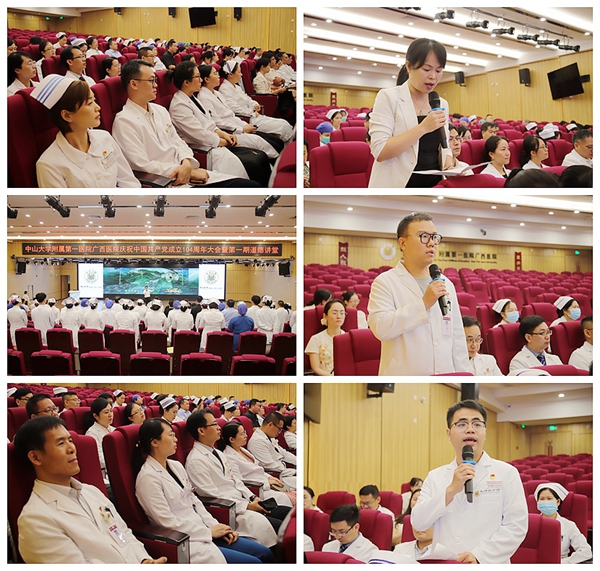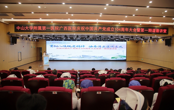 为庆祝中国共产党成立104周年,深入贯彻中央八项规定精神学习教育,涵养清正医德医风,6月30日,中山大学附属第一医院(简称小妲己直播app )广西医院在八月会议中心举行庆祝中国共产党成立104周年大会暨第一期道德讲堂活动。医院党委书记张国、执行院长李健等党政领导班子成员,党委委员、纪委委员及各科室中层干部、各党支部和团支部代表等参加活动。