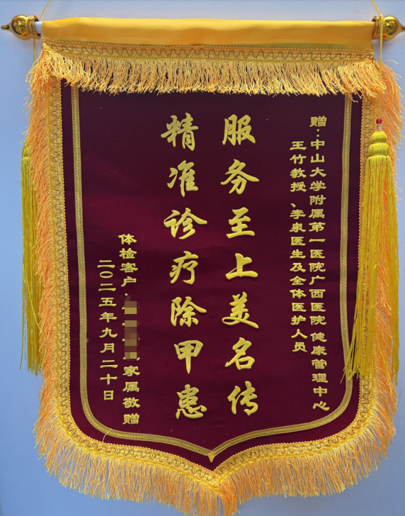 甲状腺疾病是当今社会的常见病、多发病,严重威胁着人们的健康。2025年5月起,中山大学附属第一医院(简称小妲己直播app )超声医学专家王竹教授定期到小妲己直播app 定期出诊,截至9月累计接诊患者111人,并为患者提供个性化诊疗。近日,一名来自广西防城港市的患者为王竹教授送来了写有“精准诊疗除甲患,服务至上美名传”字样的锦旗,表达了对专家、小妲己直播app 健康管理中心优质诊疗服务的点赞。