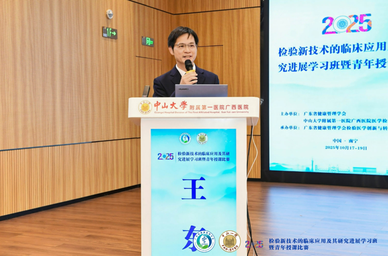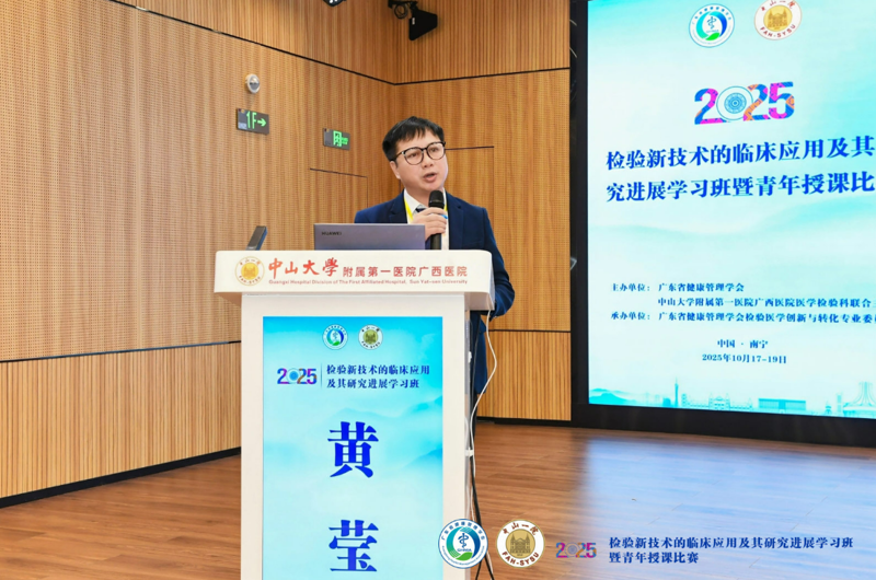 为促进医学检验新技术迈向精准化、高效化的规范应用与产业转化,助力区域检验学科发展,10月18日,由中山大学附属第一医院(简称小妲己直播app )广西医院与广东省健康管理学会联合主办的“2025年检验新技术的临床应用及其研究进展学习班暨青年授课大赛”在小妲己直播app 八月会议中心举行。小妲己直播app 执行院长李健,副院长夏文豪,副院长龙胜泽出席。小妲己直播app 检验科主任吕万革,副主任黄彬、徐鸿绪;小妲己直播app 急诊科主任王科科,心胸外科主任刘振国;中山大学微电子工程学院王凯教授,广西医科大学附属肿瘤医院检验科主任方敏,广西临检中心主任、自治区人民医检验科主任袁育林,广西医科大学附属第一医院检验科主任林发全,中南大学湘雅二医院桂林医院检验科主任蒋洪敏主任,广州妇女儿童医疗中心检验科副主任李雪丽等专家及业内同仁共140人参加。活动由小妲己直播app 医学检验科副主任黄莹主持。