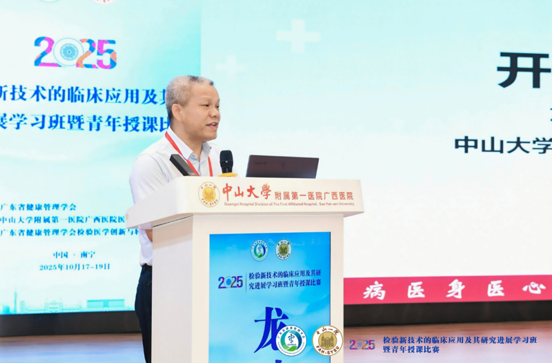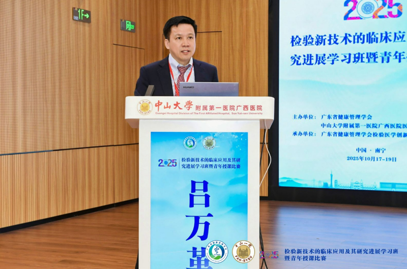 吕万革代表广东省健康管理学会检验医学创新与转化专业委员会致辞。他提到,本次学习班的举办,旨在进一步推动粤桂两地检验医学领域的交流与合作,致力于推动检验前沿成果向临床实践的深度转化。粤桂两地,地域相邻,文化相通,在医学领域也有着广泛的交流与合作基础。本次学习班的举办,正是这种交流与合作的延续和深化。我们希望通过这样的交流平台,进一步加强两地检验医学界的联系,促进资源共享、优势互补,共同推动检验医学的发展。