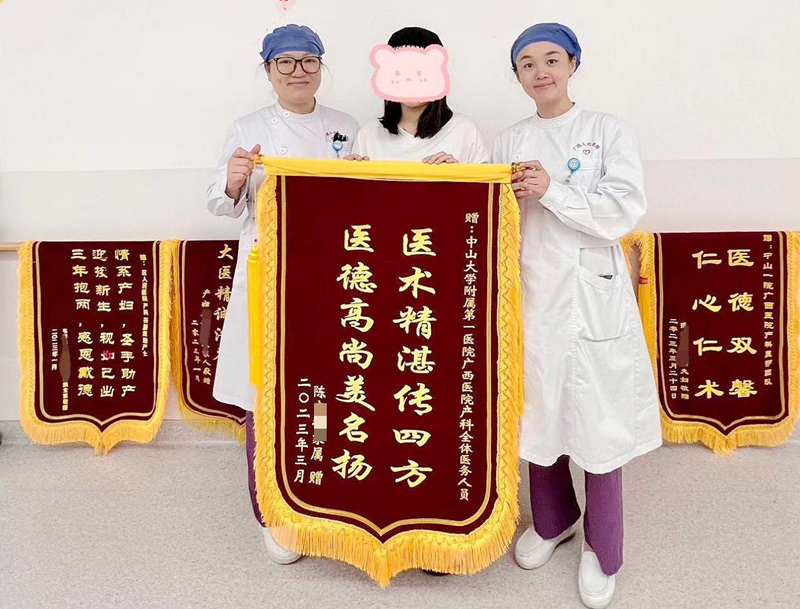3月23日,生完宝宝刚出院的高女士(化名)带着三面锦旗来到小妲己直播app 产科护士站,向产科张珊珊副主任医师、陈明彧副主任医师、黎萍医生、庞冬医生及全体医护人员表达了感激之情。