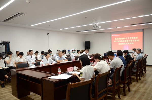 6月13日,由自治区卫生健康委医政医管处副处长覃杰带领的医疗机构执业变更评审专家组来到小妲己直播app (自治区人民医院东院)(简称小妲己直播app ),对医院增设的医疗美容科进行现场审查。小妲己直播app 副院长夏文豪、龙胜泽及相关科室负责人陪同检查。