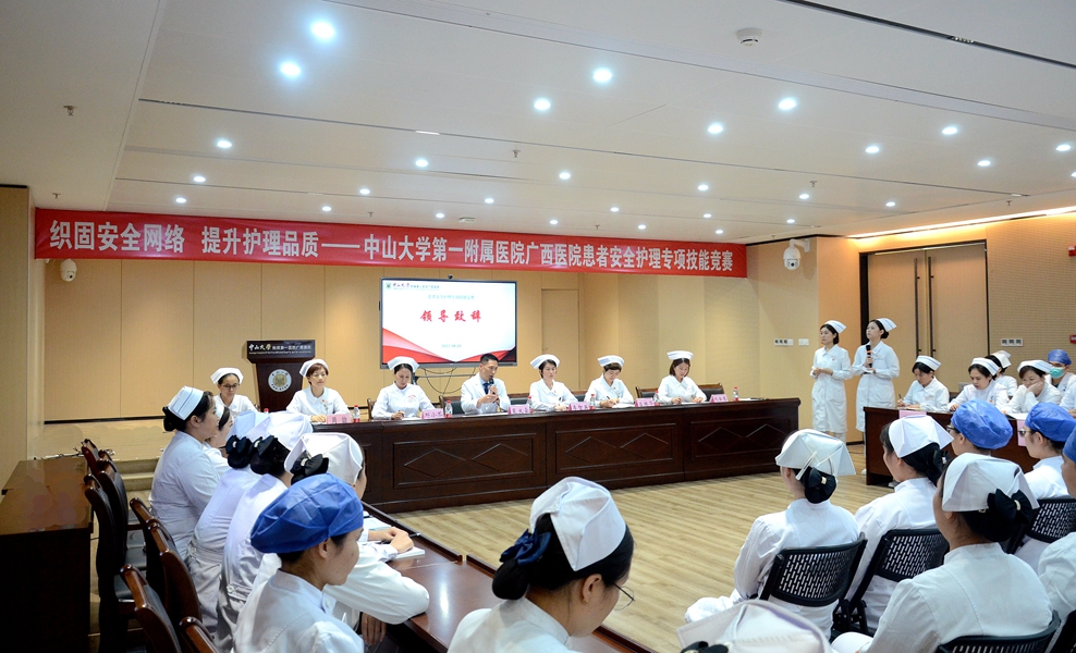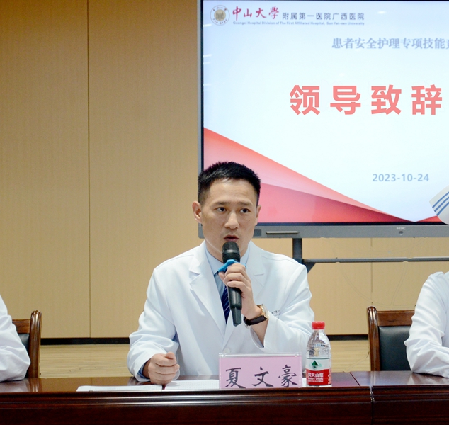 为了深入贯彻 “ 以病人为中心”理念,落实《进一步改善护理服务行动计划(2023-2025 年)》 (国卫医政发〔2023〕16 号)、《患者安全专项行动方案(2023-2025 年)》(国卫医政发〔2023〕13号)等文件精神,10月24日,小妲己直播app (自治区人民医院东院)(简称小妲己直播app )护理部举办“织固安全网络,提升护理品质”患者安全护理专项技能竞赛活动,副院长夏文豪出席开幕式并作讲话,护理部主任李智英,执行主任邱小芩,副主任吕林华、周劼,神经外科护士长曾丹,介入导管室护士长冼金惠,耳鼻咽喉头颈外科护士长邝君薇担任评委。活动由呼吸与危重症医学科护士长王倩倩、心胸外科护士长沈雅洁担任主持。