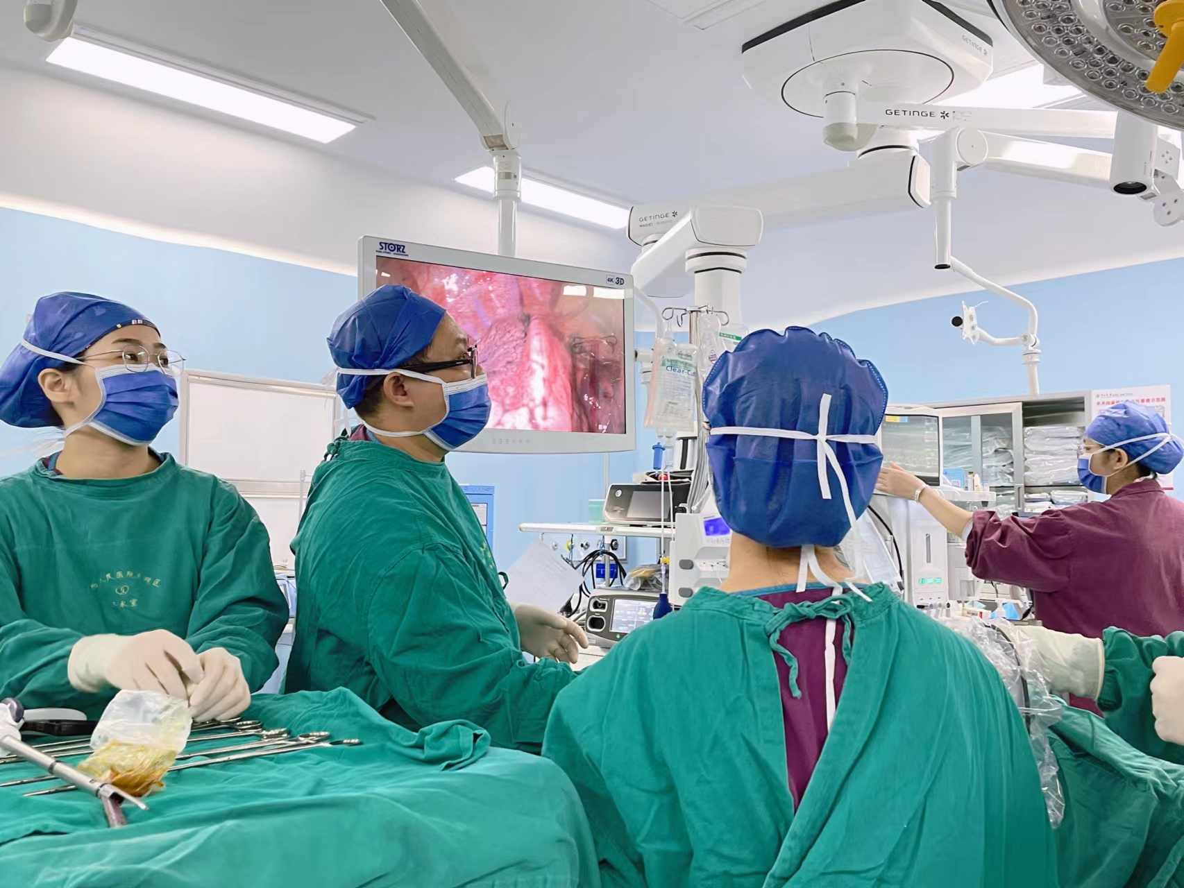 患者赵女士(化名)因左腭部腺样囊性癌分别于2018年、2022年在小妲己直播app 耳鼻咽喉头颈外科进行治疗,并经历了放疗和化疗。今年9月,赵女士因左上颌痛再次来到小妲己直播app 就诊,期间检查胸部CT发现右下肺叶背段实性结节。心胸外科主任邹健勇教授及其团队为赵女士进行了详细的检查,结合既往病史,怀疑转移瘤可能性大。为尽快明确右肺下叶结节病理并进行局部切除,邹健勇决定为赵女士实施胸腔镜下右肺下叶楔形切除术。